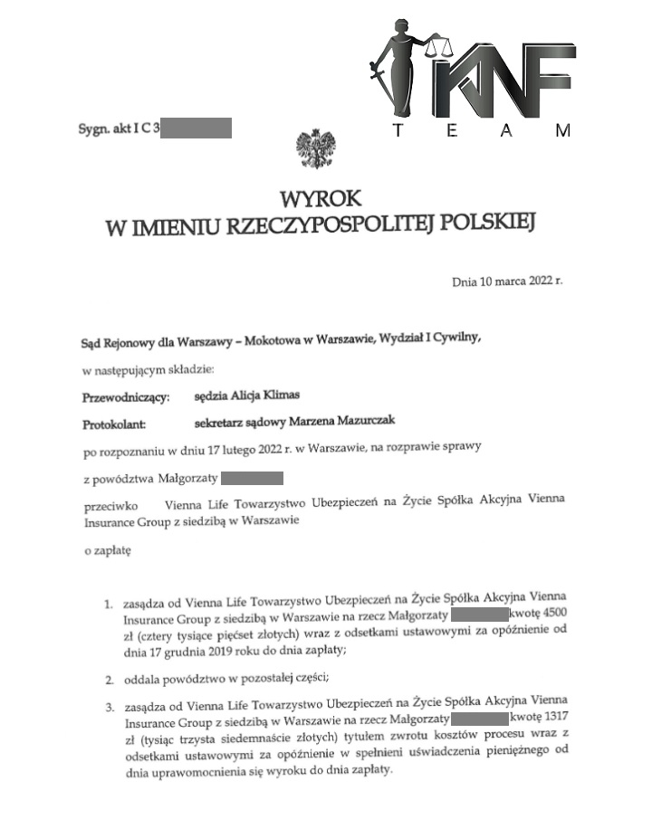 Sąd w Warszawie zasądził na rzecz naszej klientki w I Instancji 4500 zł +1317 zł oraz po oddalonej apelacji TU kolejne 450 zł!