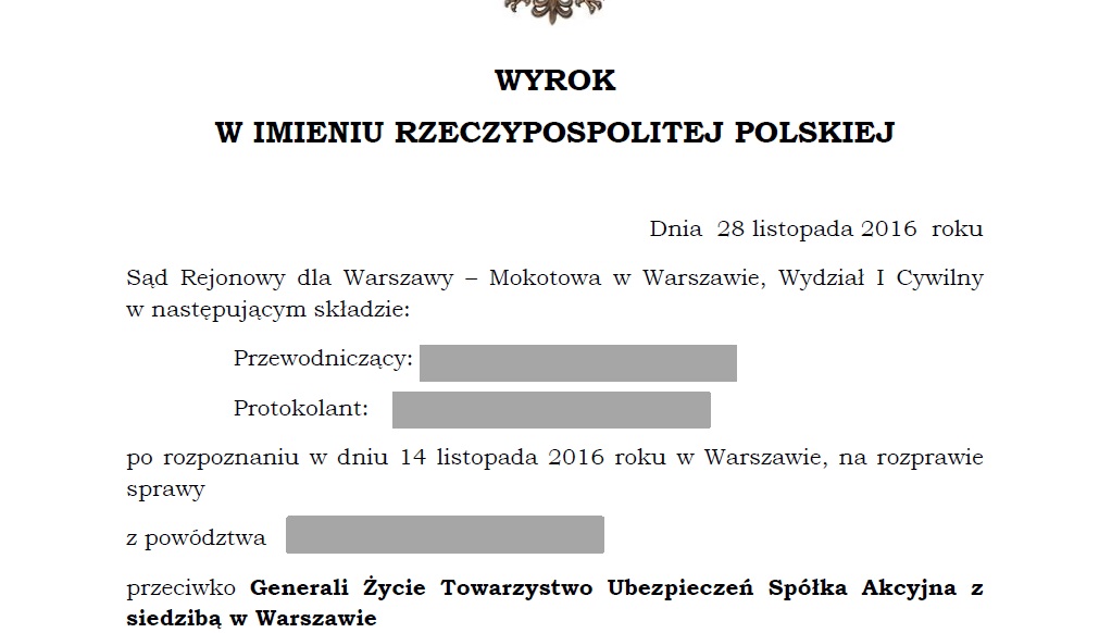 Wygrana prawie 6 tys. zł od Generali! Szczegóły w załączonym wyroku....