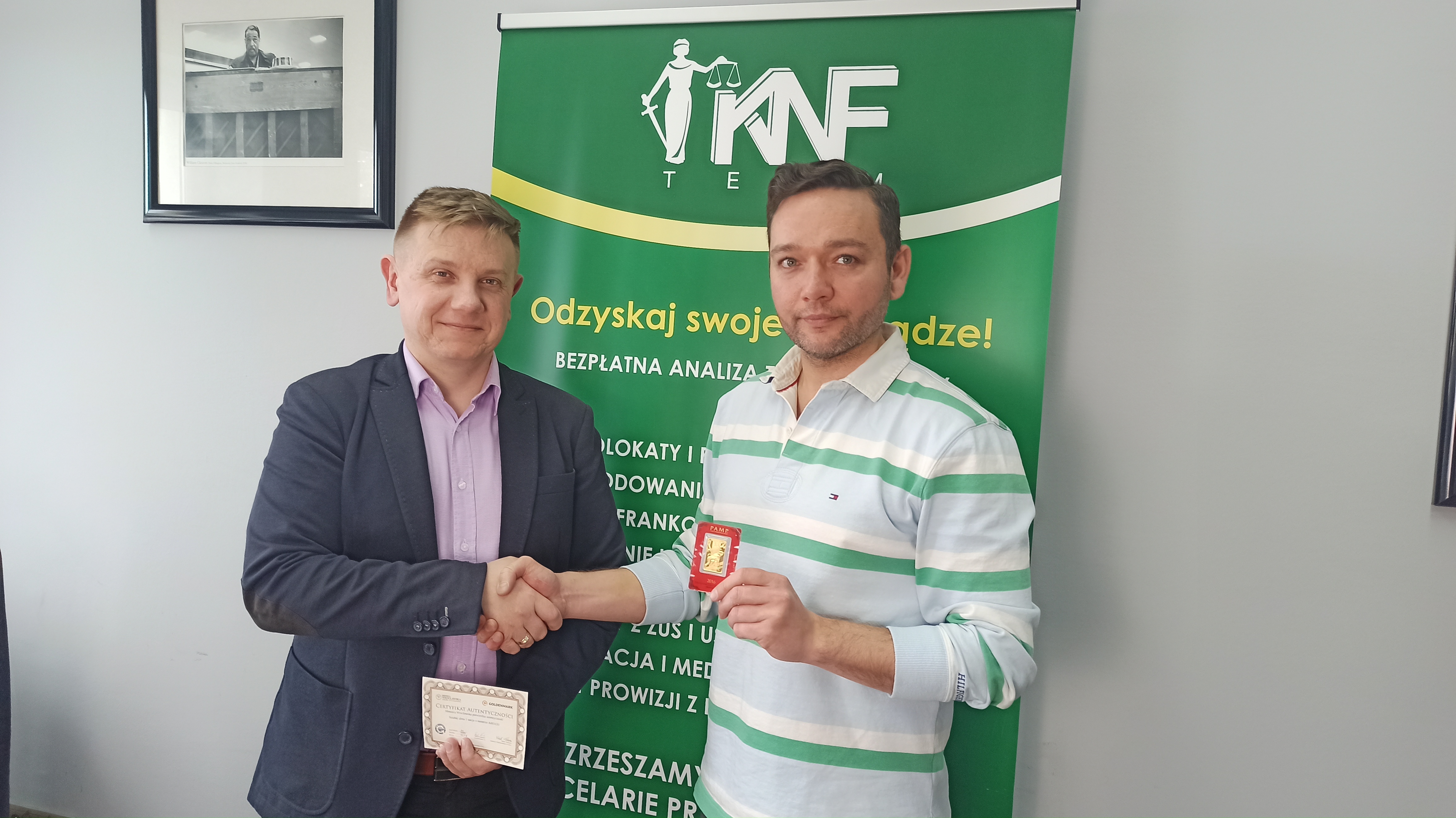 Wręczenie wygranej z konkursu w postaci sztabki złota